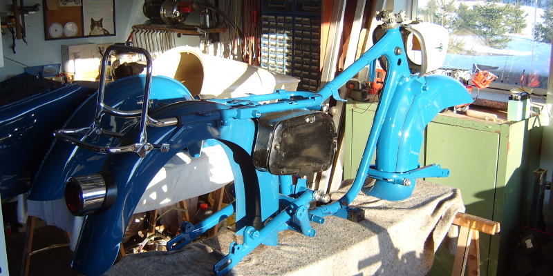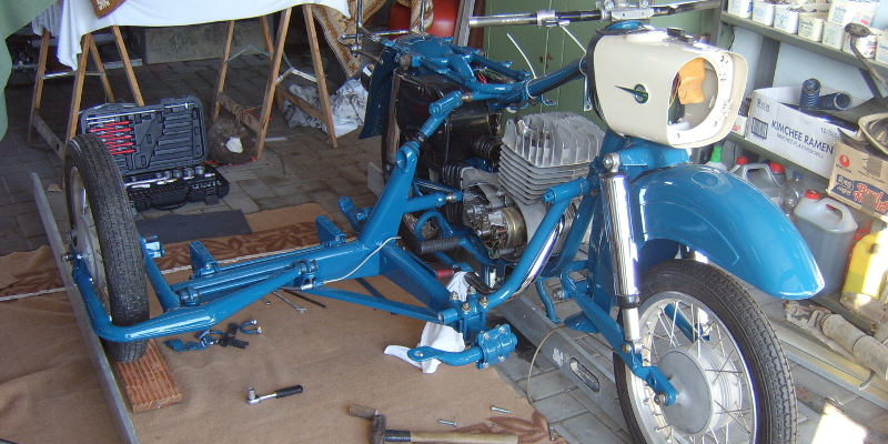Dann Monate später ergab sich der Umstand eine Solo ES 175/2 mit Motorschaden von einem Schrottplatz zu erwerben. Da alles bis auf den Motor gleich ist, hatte ich mit der Maschine schließlich genug restaurationswürdige Substanz. War nur noch das Problem mit dem ziemlich verfaulten Personenseitenwagen. Aber auch da hatte sich beständige Hartnäckigkeit ausgezahlt, da ein guter Freund auf einem Oldtimermarkt in der nähe von Halle/Saale, ein paar nette polnische Mitstreiter kennenlernte, die uns herzlichst nach Polen einluden, sich dort aus ihrem Fundus zu bedienen. Was wir dort sahen, war unglaublich und würde einen eigenen Blog rechtfertigen. Jedenfalls hatte ich anschließend endlich ein restaurationswürdiges Gesamtmotorrad. In den nächsten Monaten wurden die technischen Komponenten dann aufwendig erneuert.